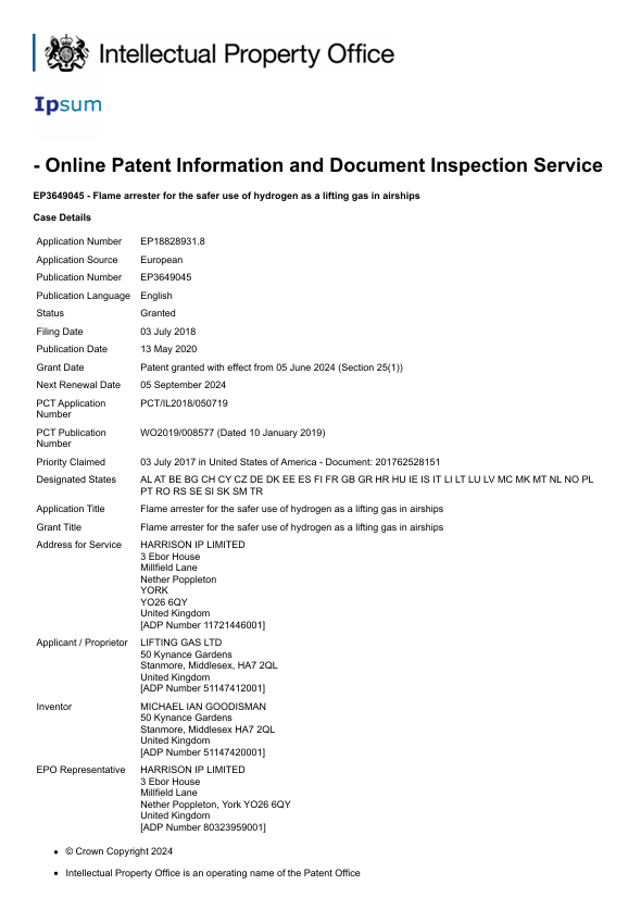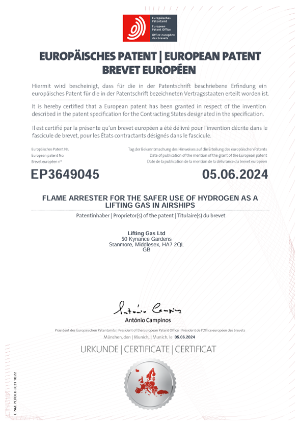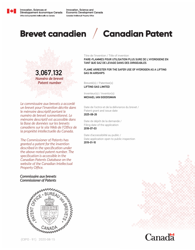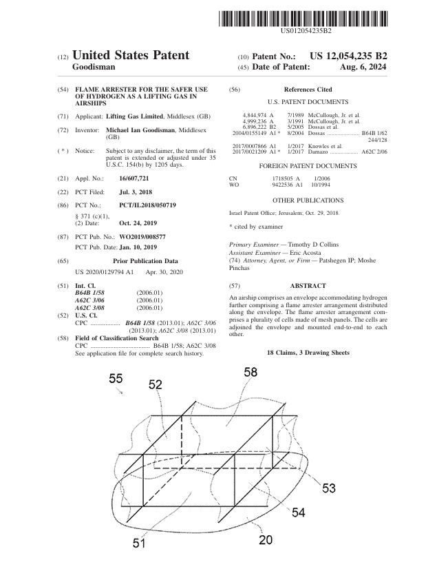 Goodisman, M.I., 2019, “Flame Arrester for the Safer Use of Hydrogen as a Lifting Gas in Airships”, International Application Published under the Patent Cooperation Treaty (PCT), WO 2019/008577 A1. (Full text).