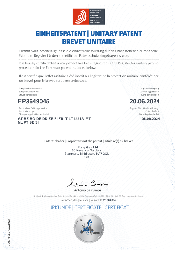 Lifting Gas has this innovation patented in Canada, China, Europe (for the 18 EU Member States participating in the Unitary Patent scheme plus the UK) and the USA.